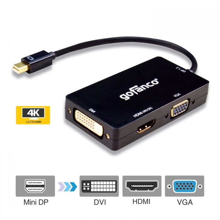 Adaptateur Mini DisplayPort 3 en 1 vers HDMI, DVI et VGA pour connecter facilement votre appareil à tout type d’écran.